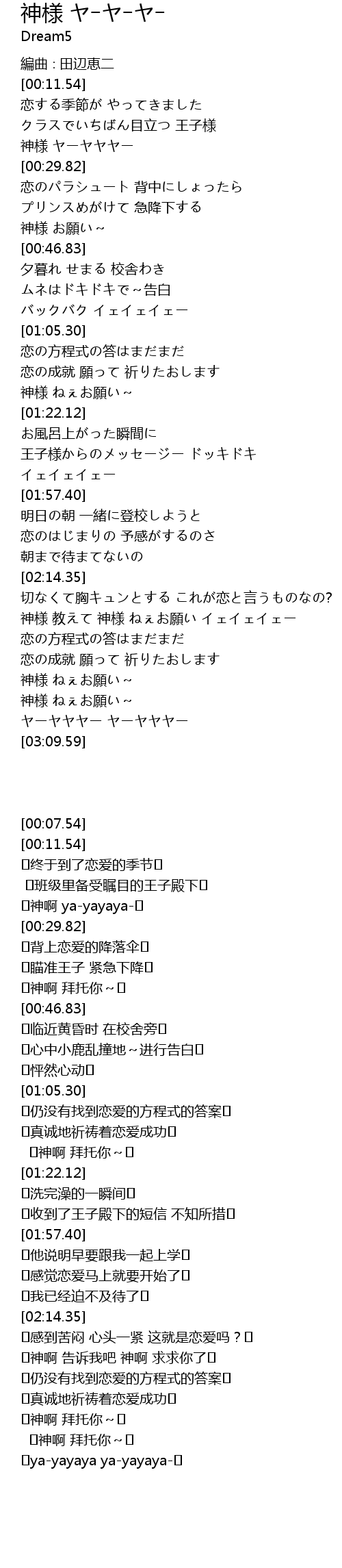 | [02:26.45] | 神様 教えて 神様 ねぇお願い イェイェイェー |