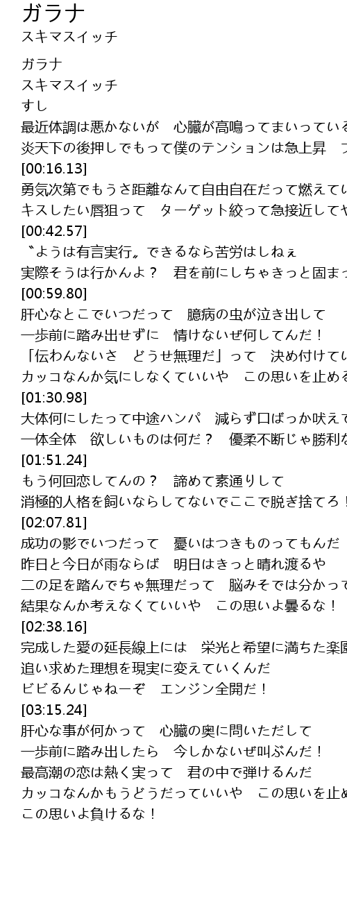 | [03:38.81] | カッコなんかもうどうだっていいや この思いを止めるな |