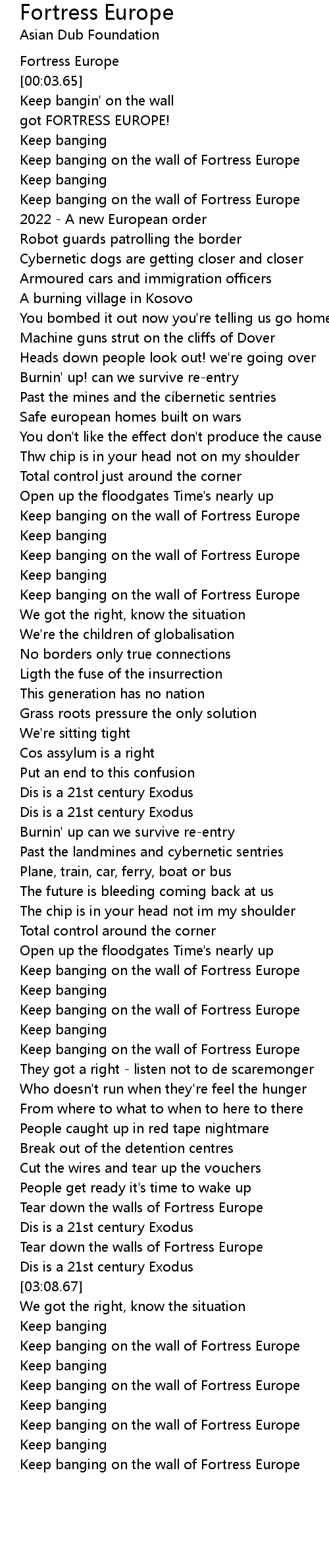 | [03:01.53] | Tear down the walls of Fortress Europe |