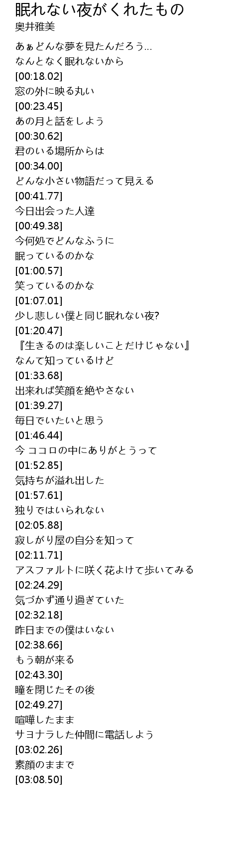 | [01:09.77] | 少し悲しい僕と同じ眠れない夜? |
