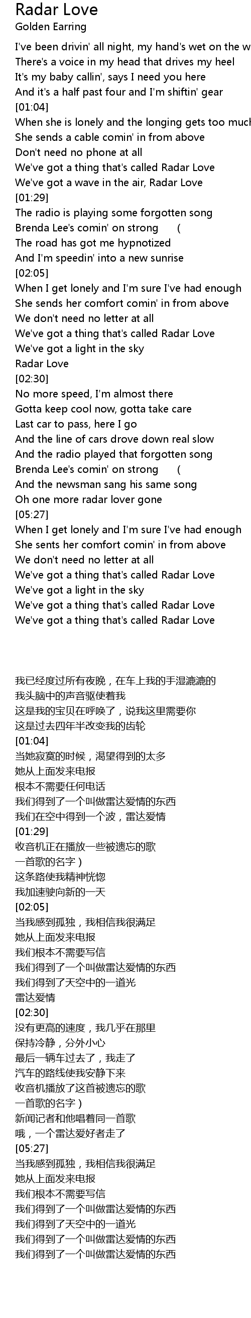 | [01:19] | We' ve got a thing that' s called Radar Love |
