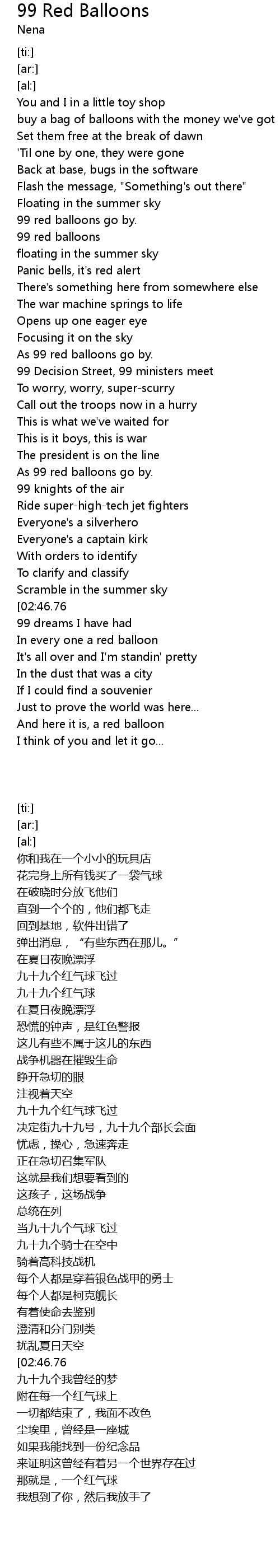 | [02:57.60][02:46.76] | As 99 red balloons go by. |