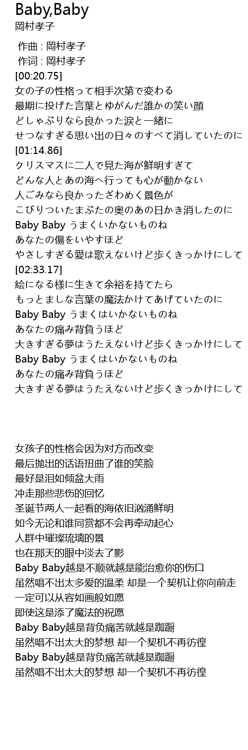 | [02:09.36] | Baby Baby うまくいかないものね あなたの傷をいやすほど |