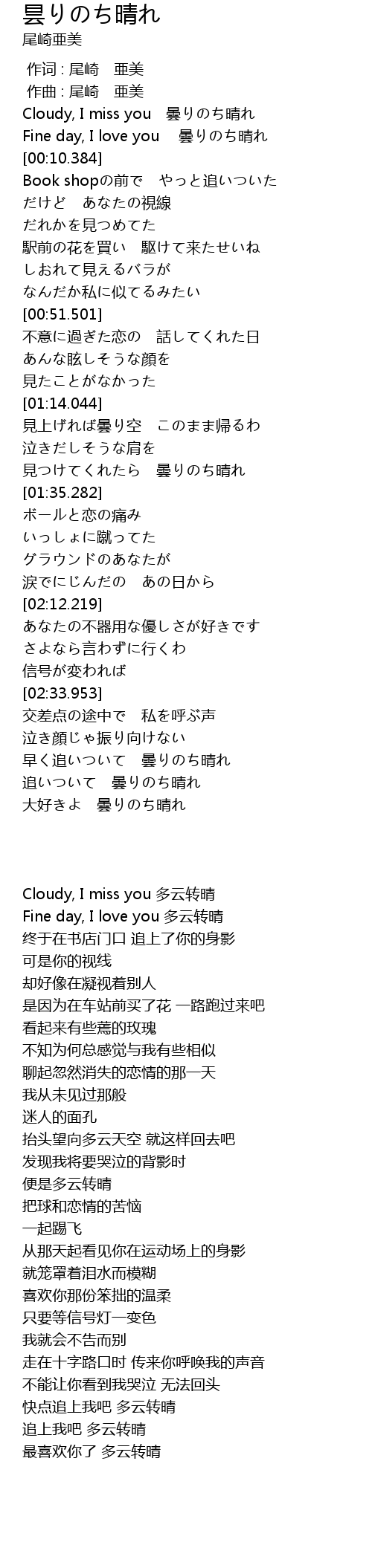 | [00:01.032] | Cloudy, I miss you 曇りのち晴れ |