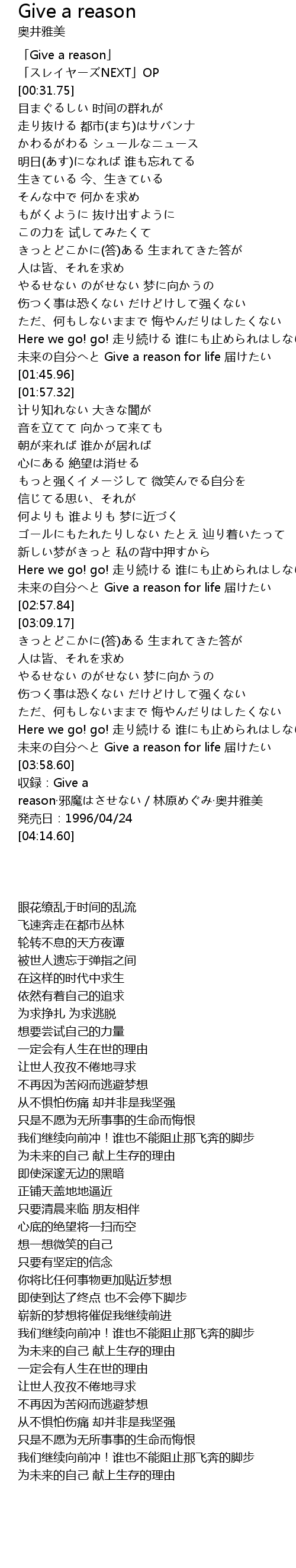 | [04:00.60] | 収録:Give a reason·邪魔はさせない/林原めぐみ·奥井雅美 |