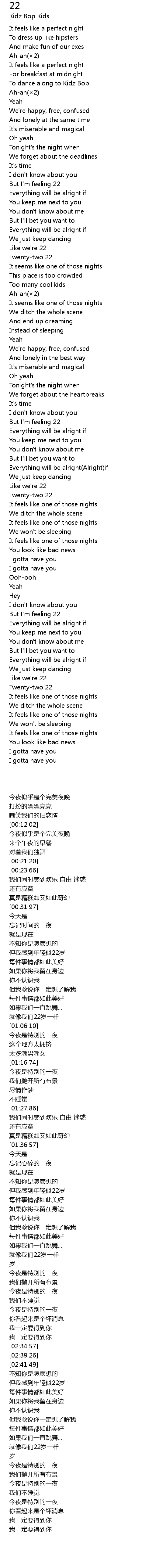 | [00:44.38] | But I' m feeling 22 |