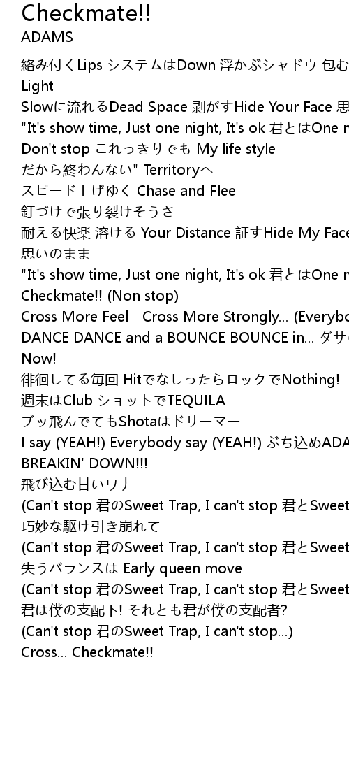 | [01:18.55] | " It' s show time, Just one night, It' s ok jūn One night" Checkmate!! Non stop |
