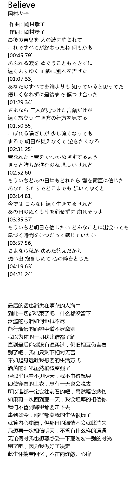 | [03:37.21] | もういちど明日を信じたい どんなことに出会っても |