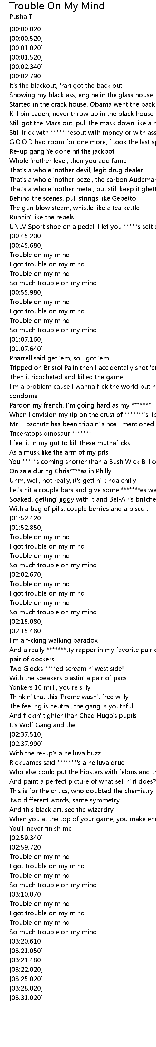 | [03:01.670] | I got trouble on my mind |