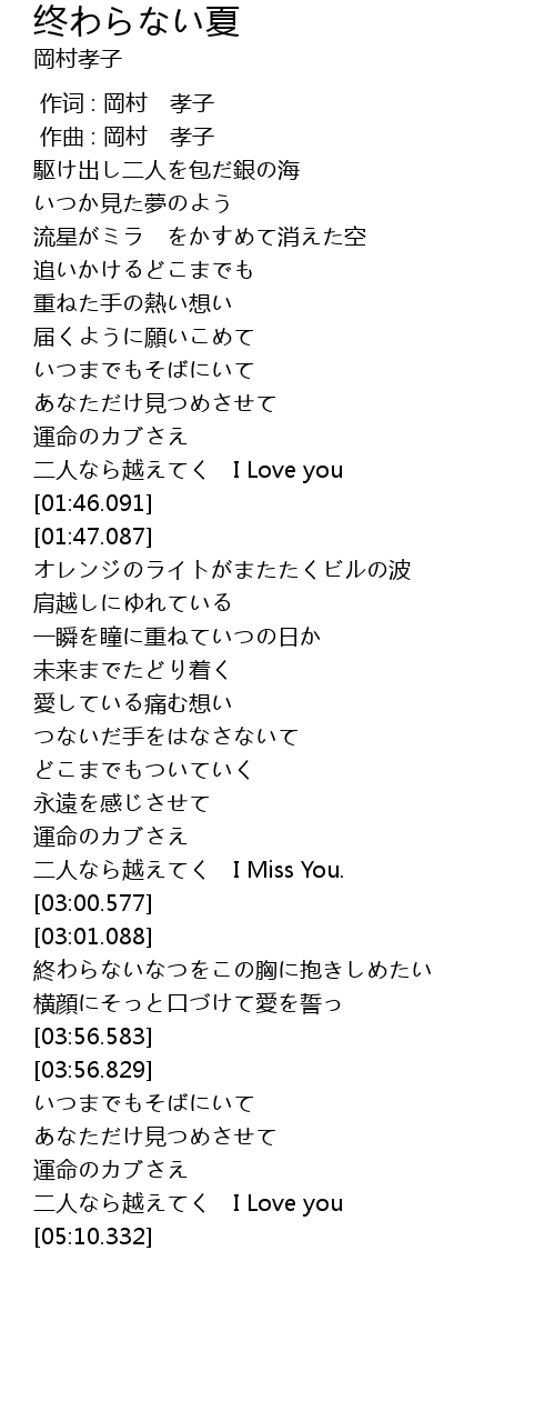 | [03:40.086] | 終わらないなつをこの胸に抱きしめたい |