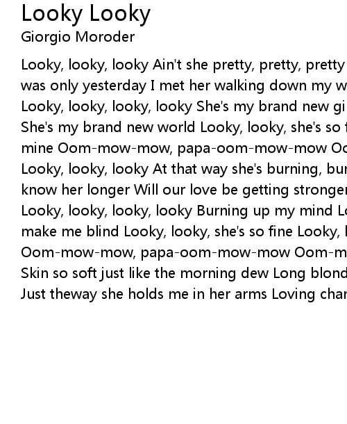 Looky, looky, looky, looky She's my brand new girl Looky, looky, looky, looky She's my brand new world Looky, looky, she's so fine Looky, looky, and she's mine Oom-mow-mow, papa-oom-mow-mow Oom-mow-mow, papa-oom-mow-mow |