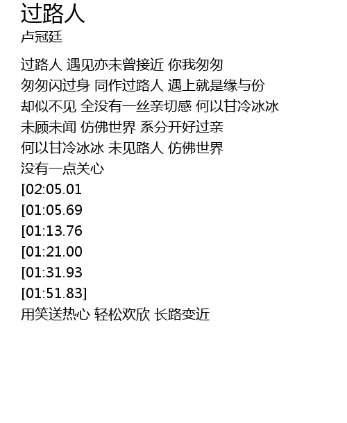 | [00:59.56][02:05.01] | 过路人 下次若是人再近 |