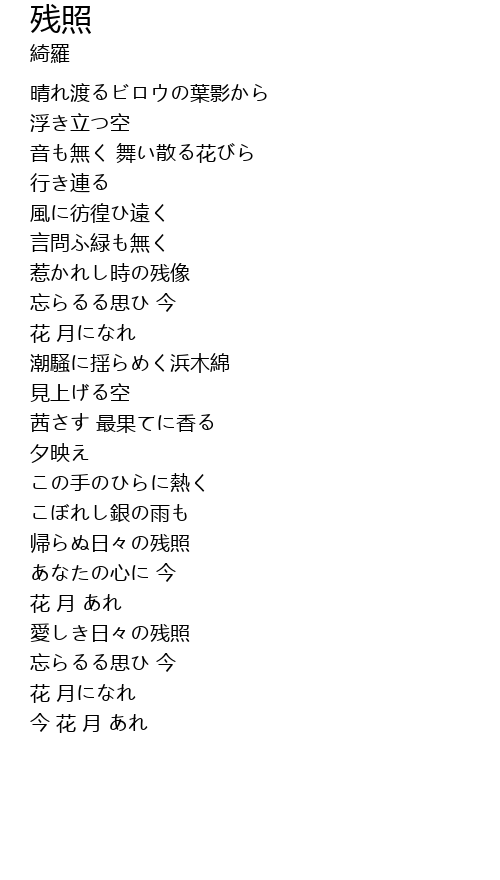 | [00:34.91] | 音も無く 舞い散る花びら |