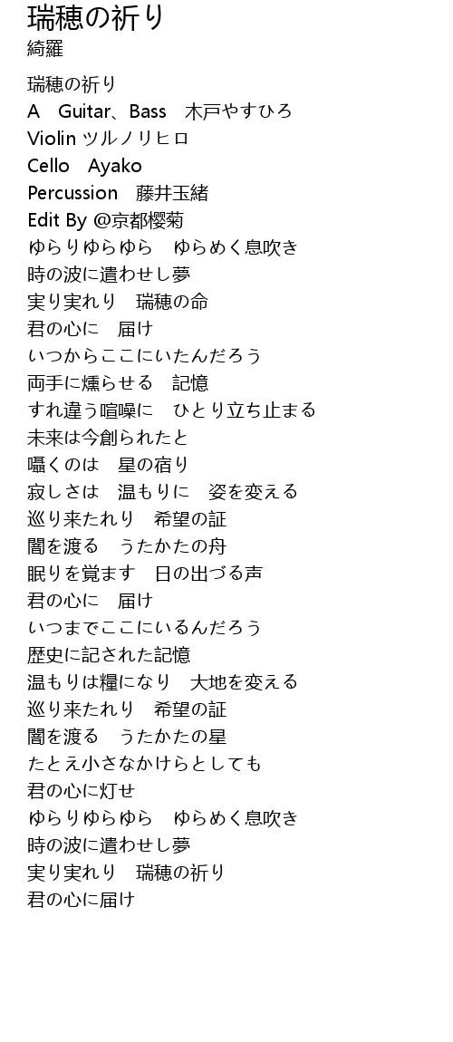 | [03:19.41] | 実り実れり 瑞穂の祈り |