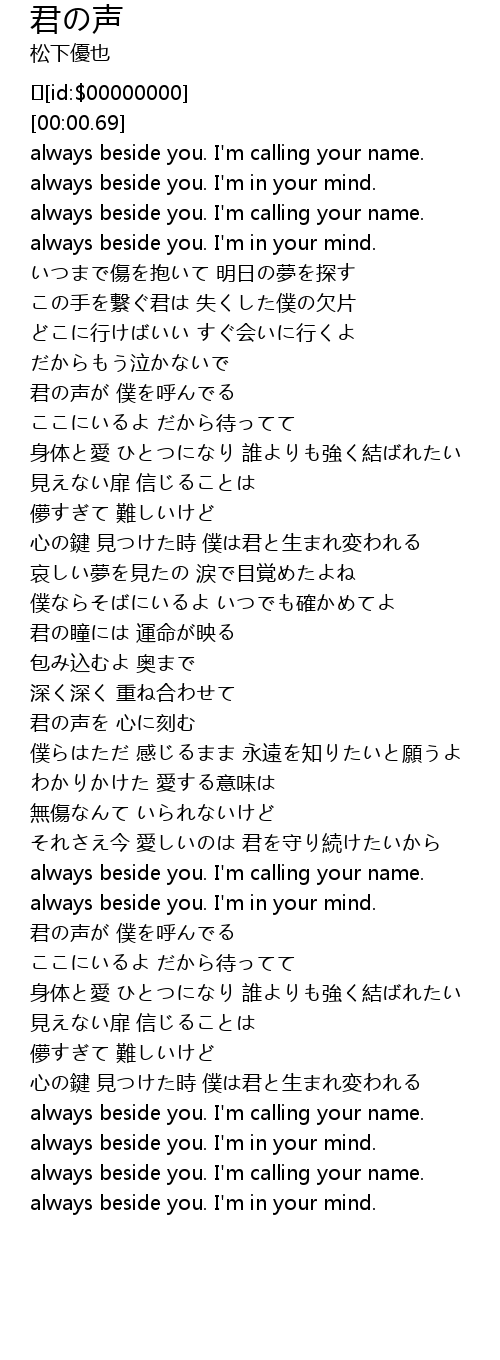 | [00:01.134] | always beside you. I' m calling your name. |