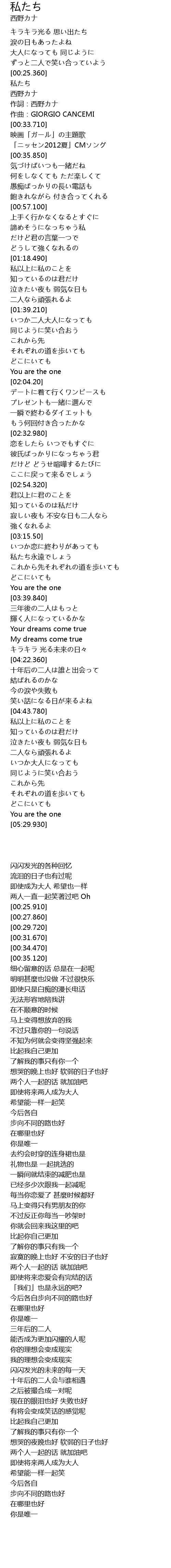 | [00:29.720] | 作詞:西野カナ |