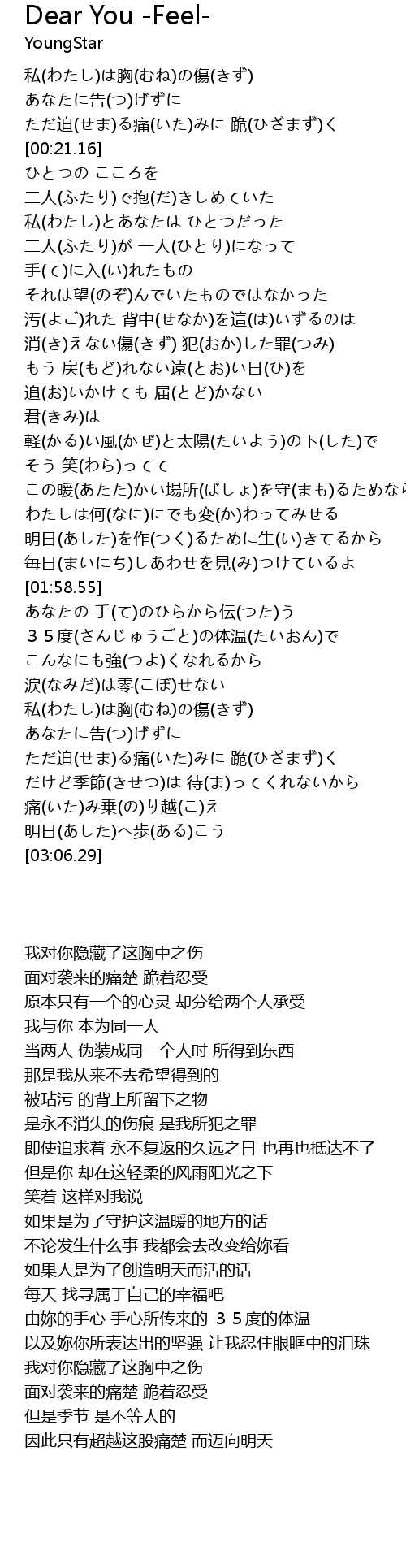 | [02:20.09] | あなたの 手(て)のひらから伝(つた)う 35度(さんじゅうごと)の体温(たいおん)で |