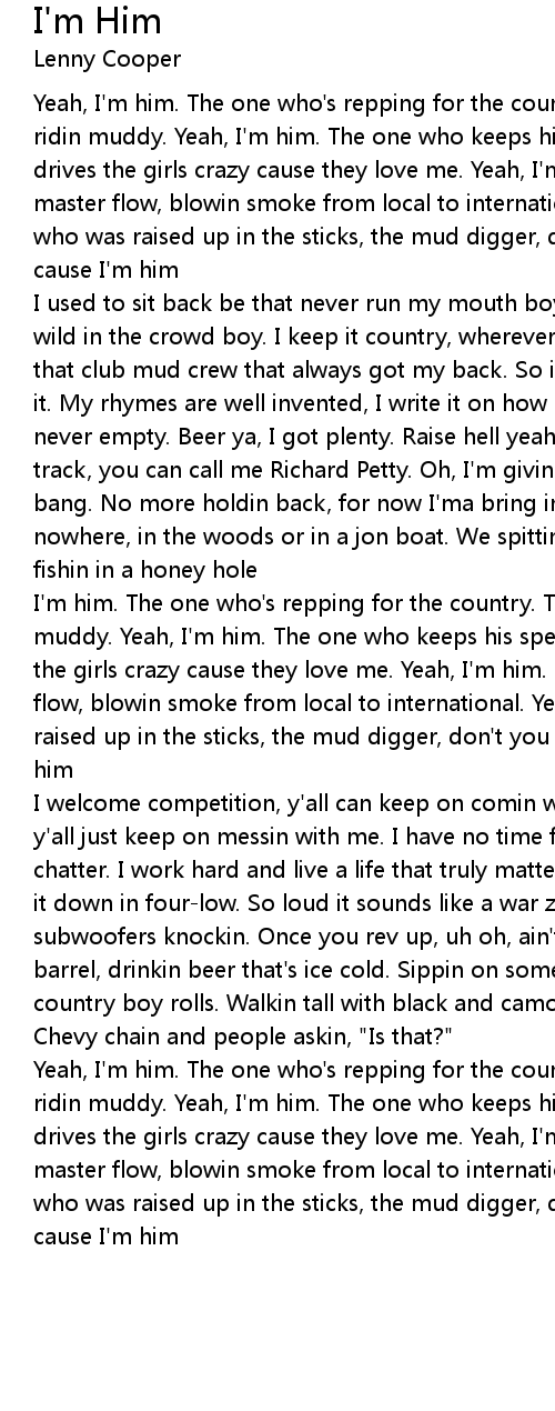 Yeah, I'm him. The one who's repping for the country. The one who's stuntin, ridin muddy. Yeah, I'm him. The one who keeps his speakers bumpin. The one that drives the girls crazy cause they love me. Yeah, I'm him. The one who's got that master flow, blowin smoke from local to international. Yeah, I'm him. The one who was raised up in the sticks, the mud digger, don't you ever forget. Yeah, cause I'm him |