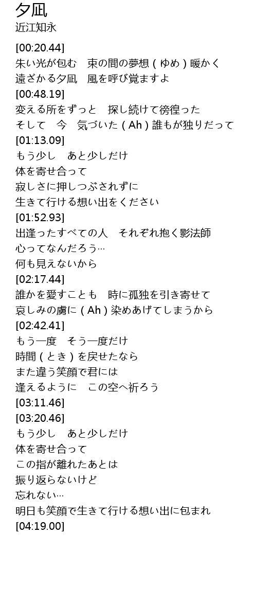| [00:25.38] | 朱い光が包む 束の間の夢想(ゆめ)暖かく |
