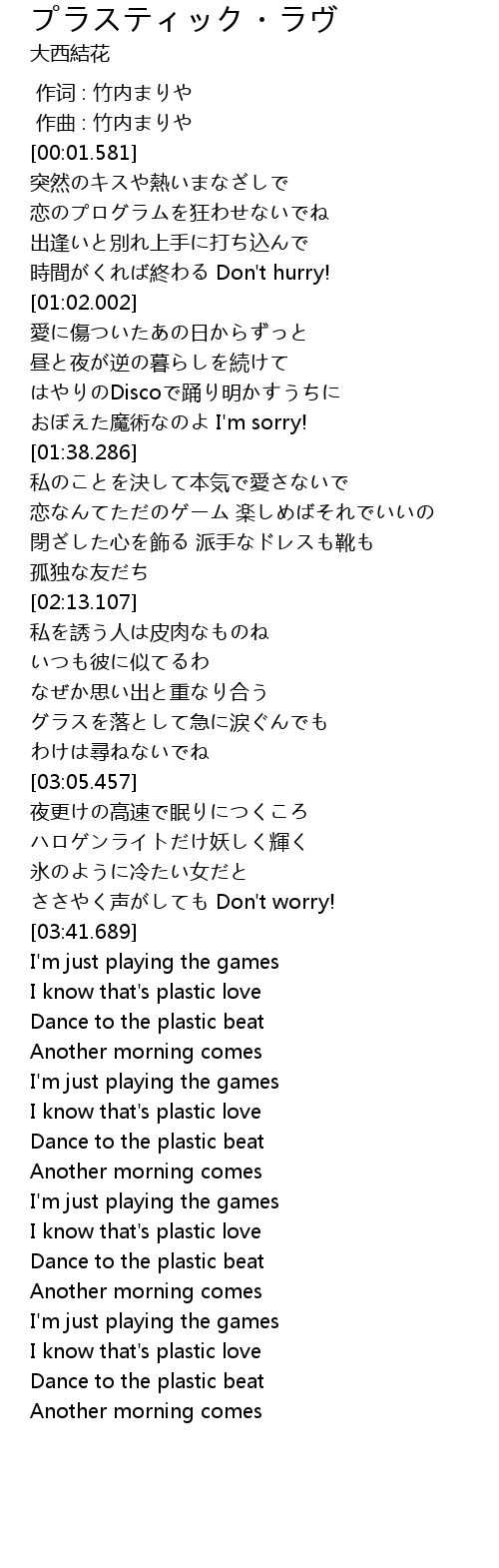 | [03:47.436] | I know that' s plastic love |
