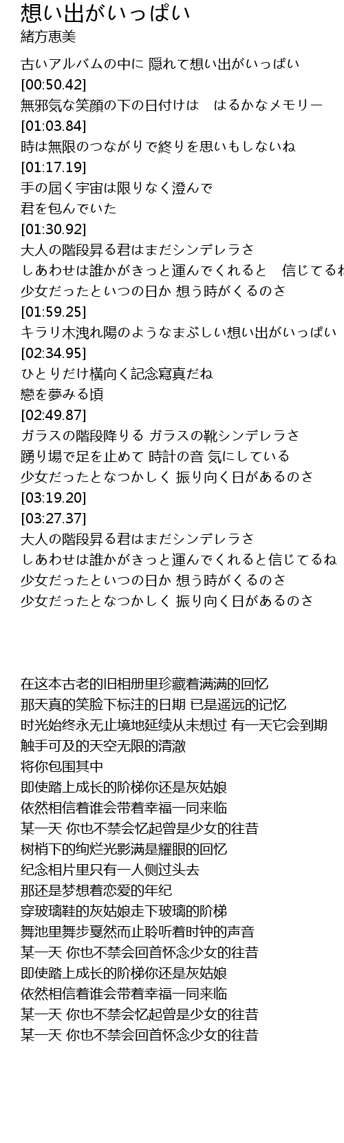 | [00:38.41] | 古いアルバムの中に 隠れて想い出がいっぱい |
