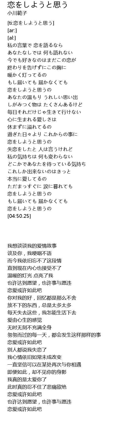 | [04:32.68] | 恋をしようと思うの |