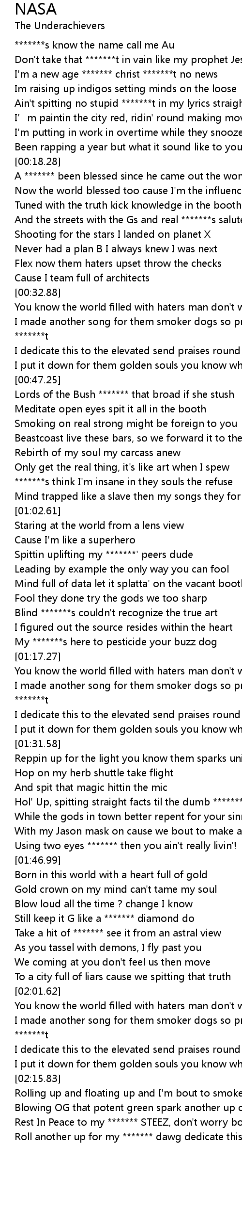 | [01:05.07] | Spittin uplifting my *******' peers dude |