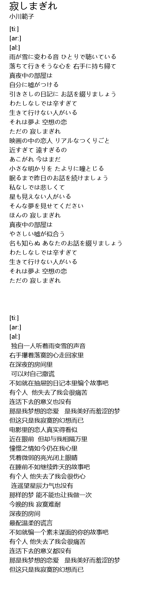 | [00:08.14] | 雨が雪に変わる音 ひとりで聴いている |