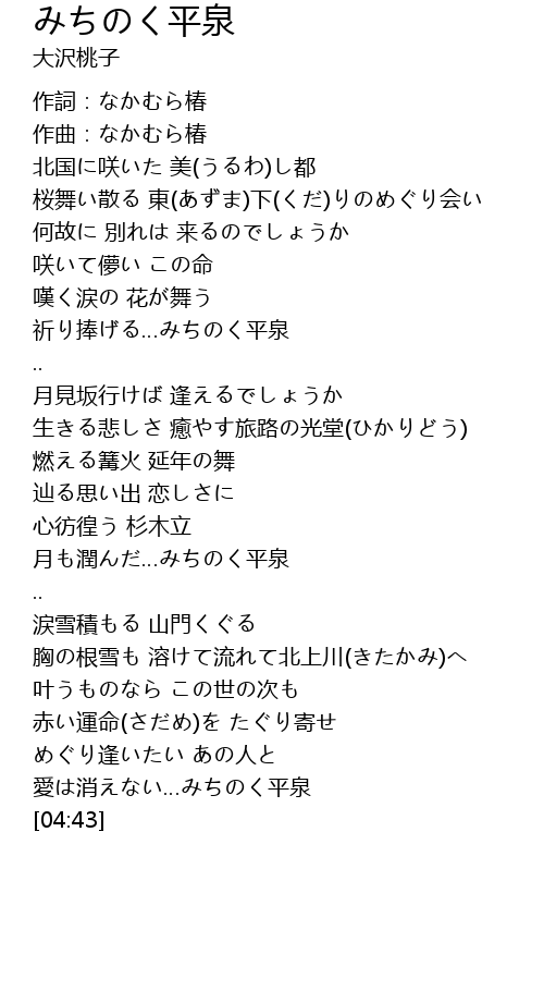 | [03:36] | 胸の根雪も 溶けて流れて北上川(きたかみ)へ |