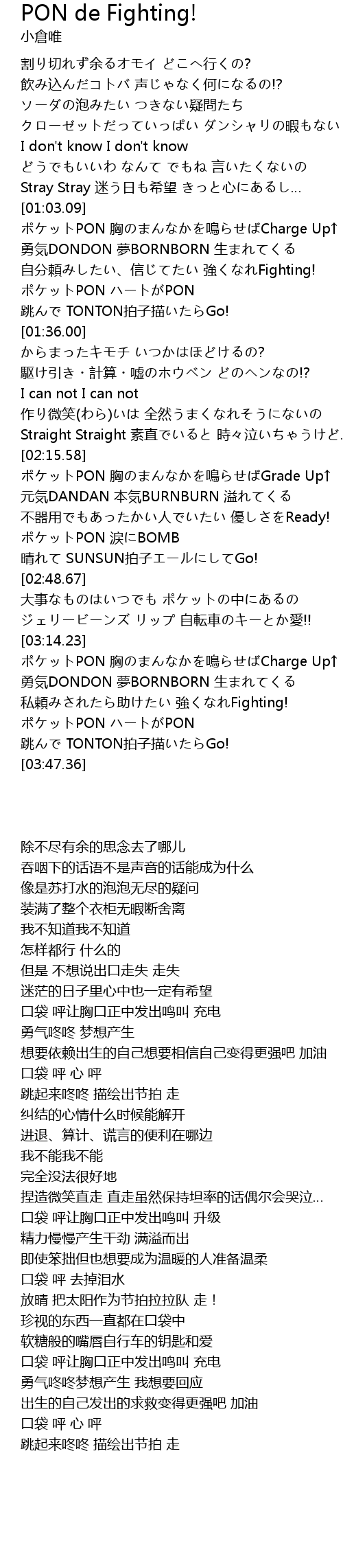 | [03:17.01] | ポケットPON 胸のまんなかを鳴らせばCharge Up↑ |