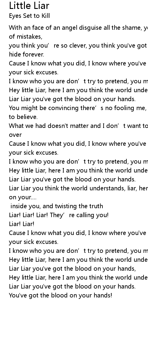 | Liar Liar you think the world understands, liar, here i am you' ve got the blood on your.... | |