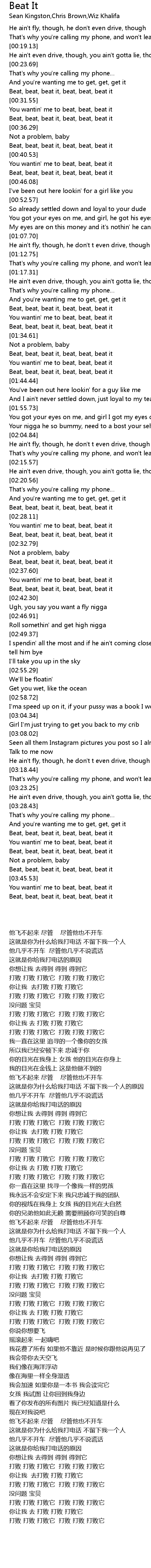 | [03:33.48] | Beat, beat, beat it, beat, beat, beat it |