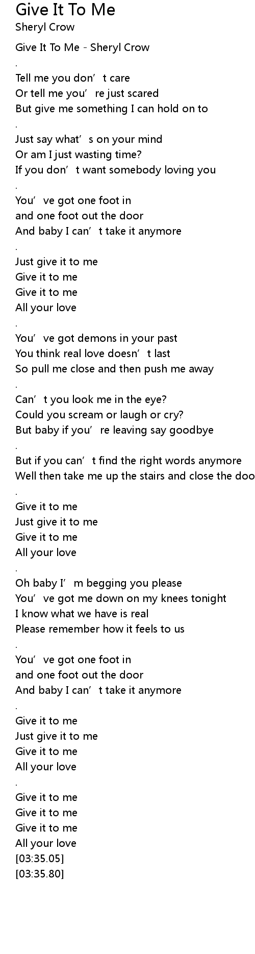 | [00:00.47] | Give It To Me Sheryl Crow |