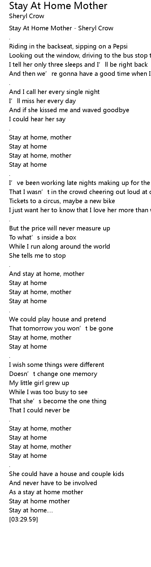 | [00:00.52] | Stay At Home Mother - Sheryl Crow |