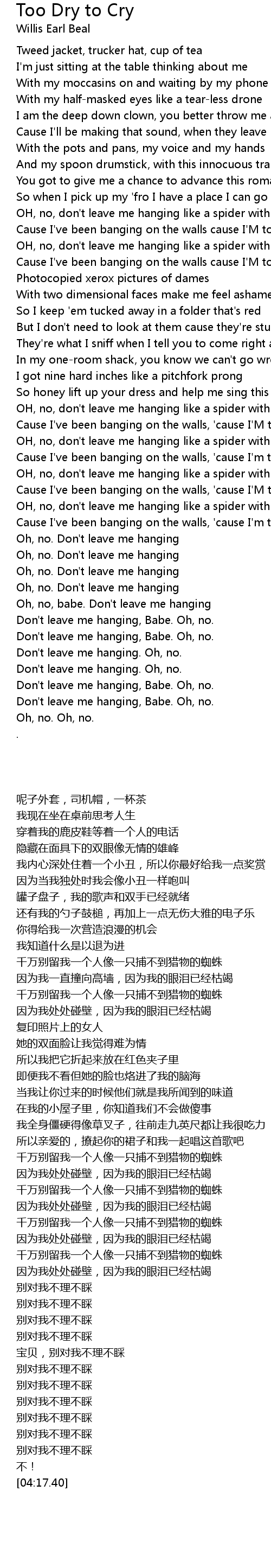 Cause I've been banging on the walls cause I'M too dry to cry. |