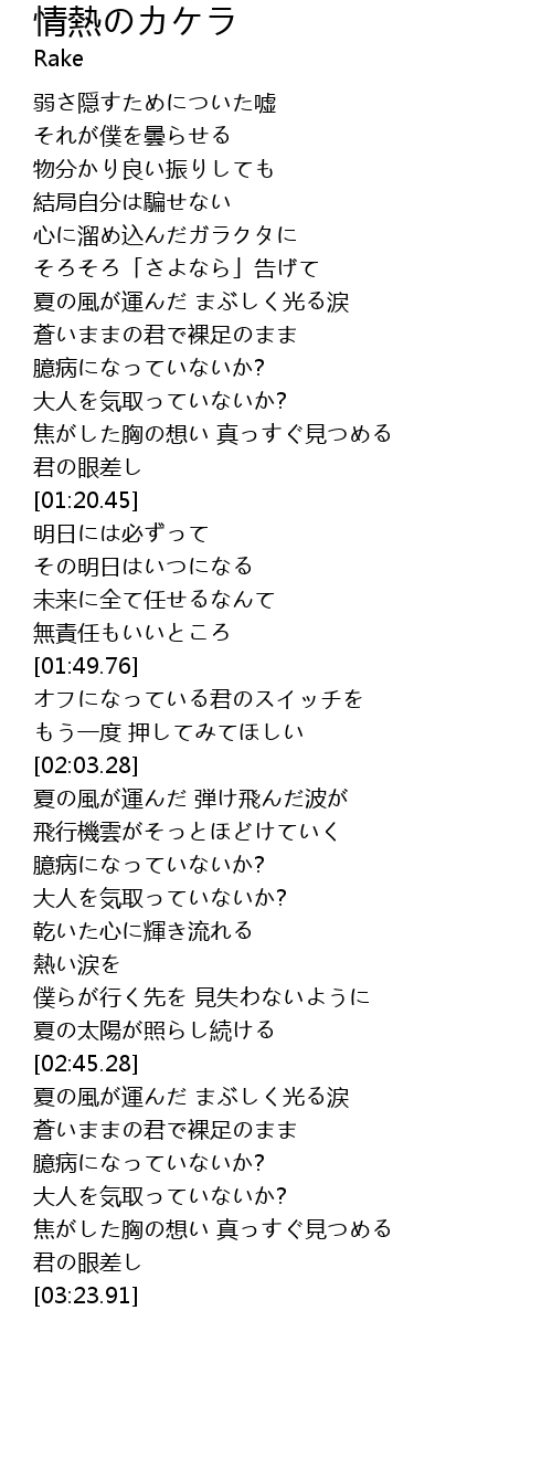 | [02:03.70] | 夏の風が運んだ 弾け飛んだ波が |