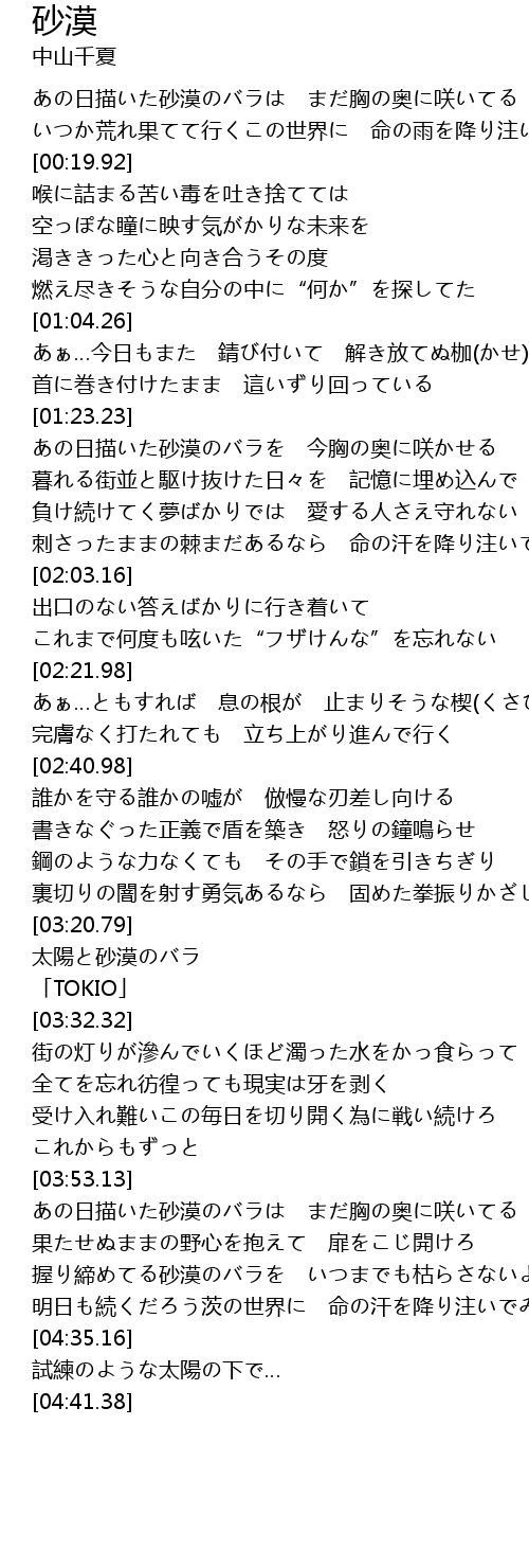 | [03:57.34] | あの日描いた砂漠のバラは まだ胸の奥に咲いてる |