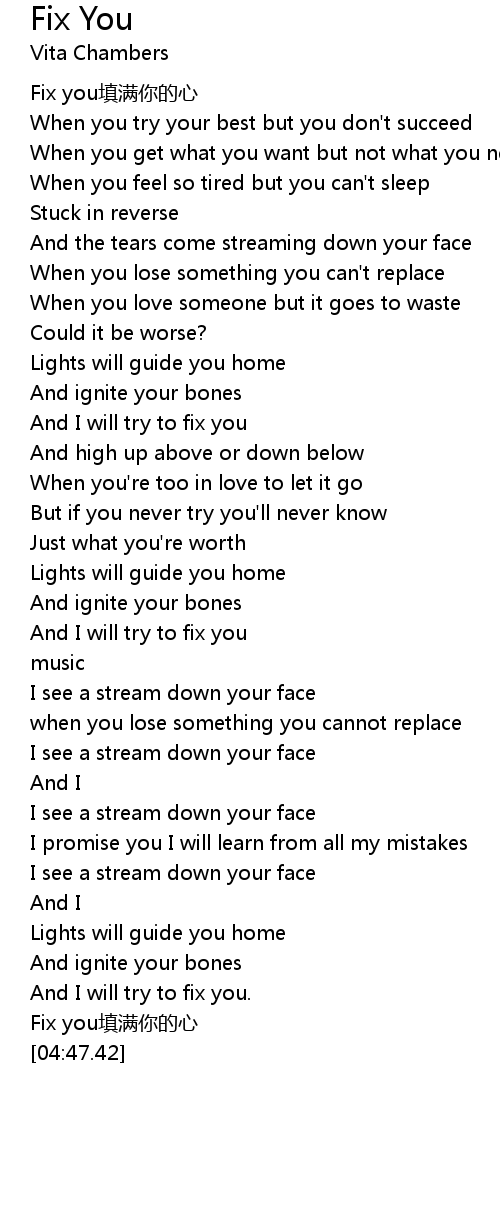 | [01:25.51] | And I will try to fix you |