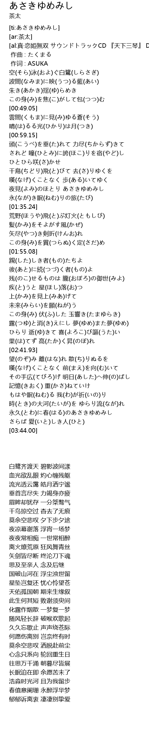 | [02:26.60] | 露(つゆ)と消(き)えにし 夢(ゆめ)また夢(ゆめ) |
