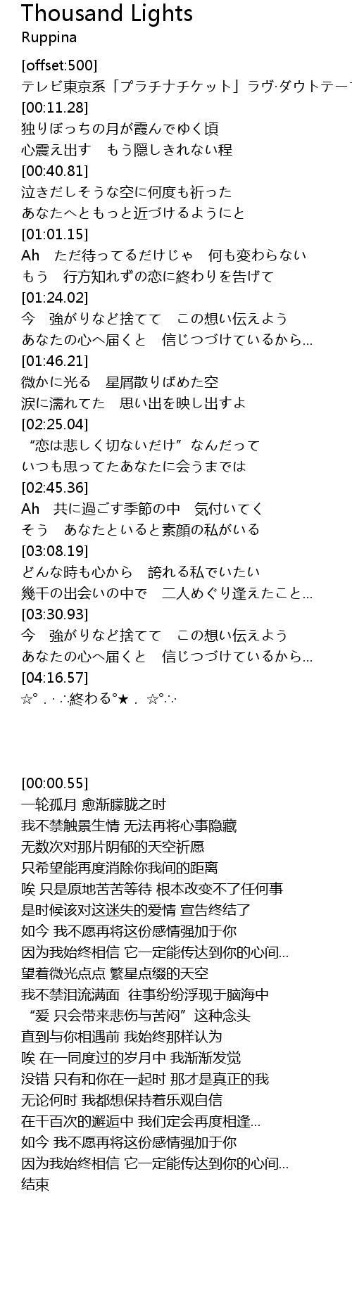 | [01:11.88] | もう 行方知れずの恋に終わりを告げて |