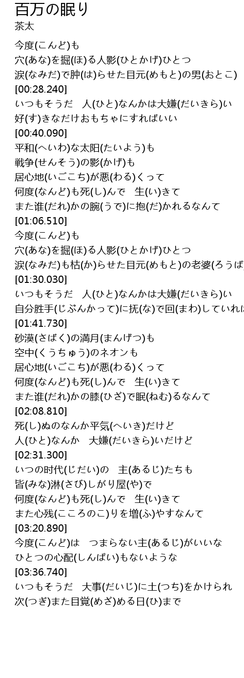 | [00:28.540] | いつもそうだ 人(ひと)なんかは大嫌(だいきら)い |
