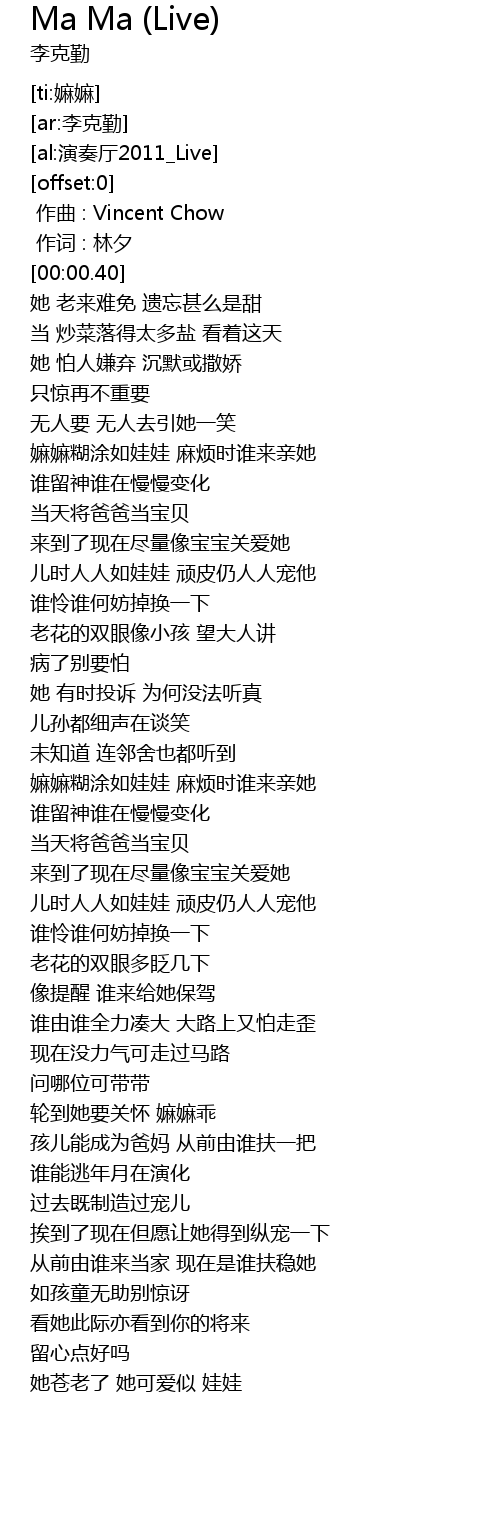| [02:46.37] | 嫲嫲糊涂如娃娃 麻烦时谁来亲她 |