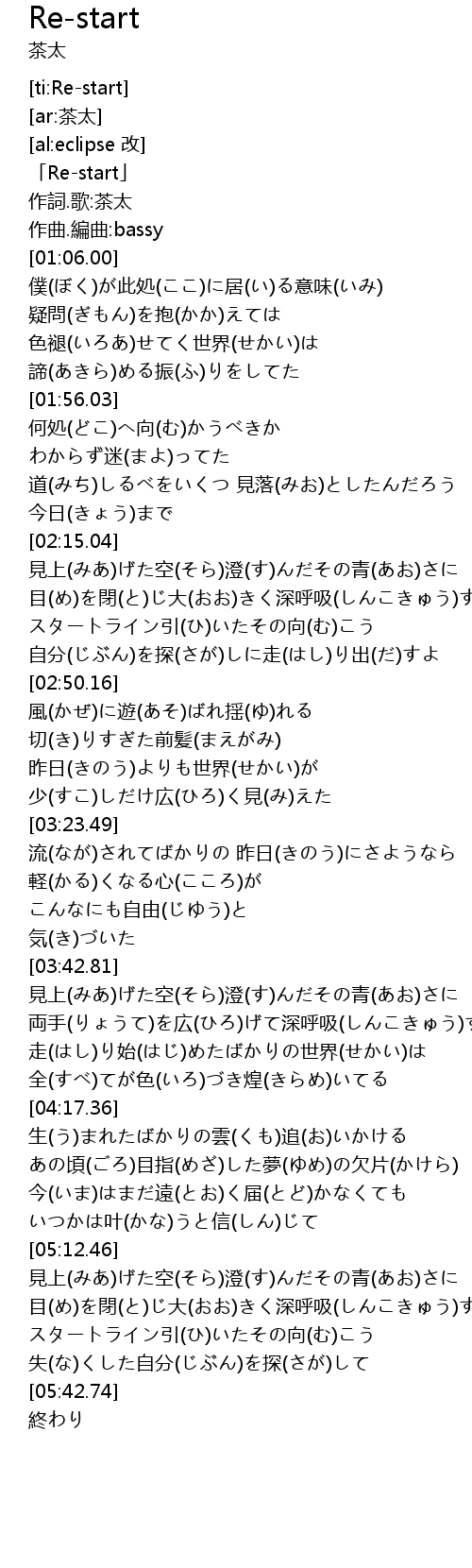 | [05:28.16] | スタートライン引(ひ)いたその向(む)こう 失(な)くした自分(じぶん)を探(さが)して |