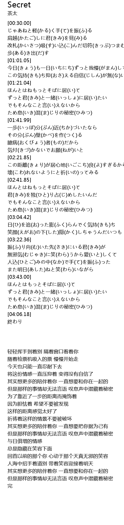 | [03:52.66] | でもそんなこと言(い)えないから ため息(いき)混(ま)じりの秘密(ひみつ) |