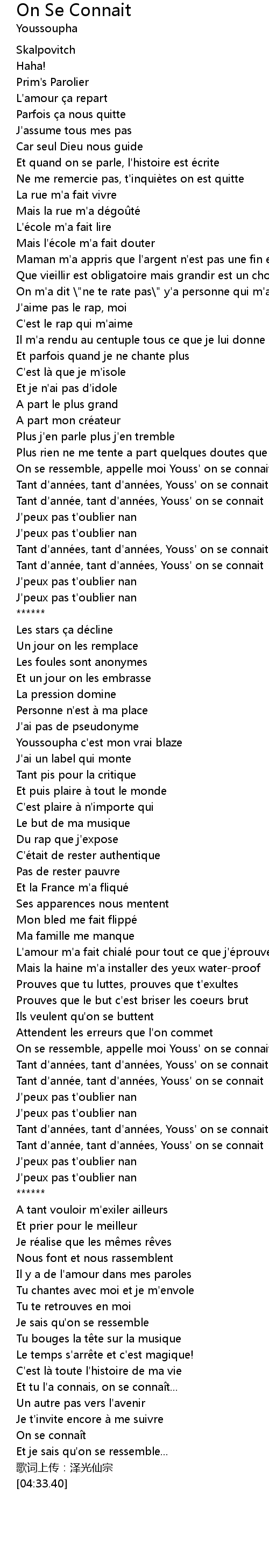 | [02:20.28] | Tant d'années, tant d'années, Youss' on se connait |