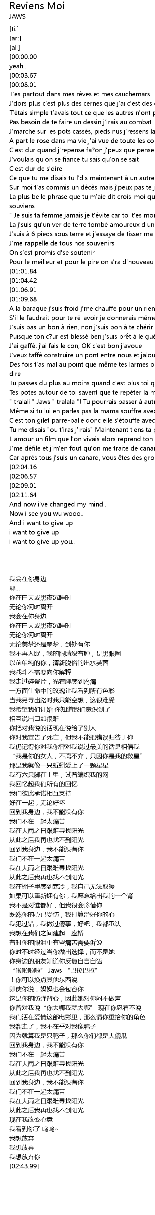 | [01:44.99] | " tralali " Jaws " tralala "! Tu pourrais passer à autre chose |
