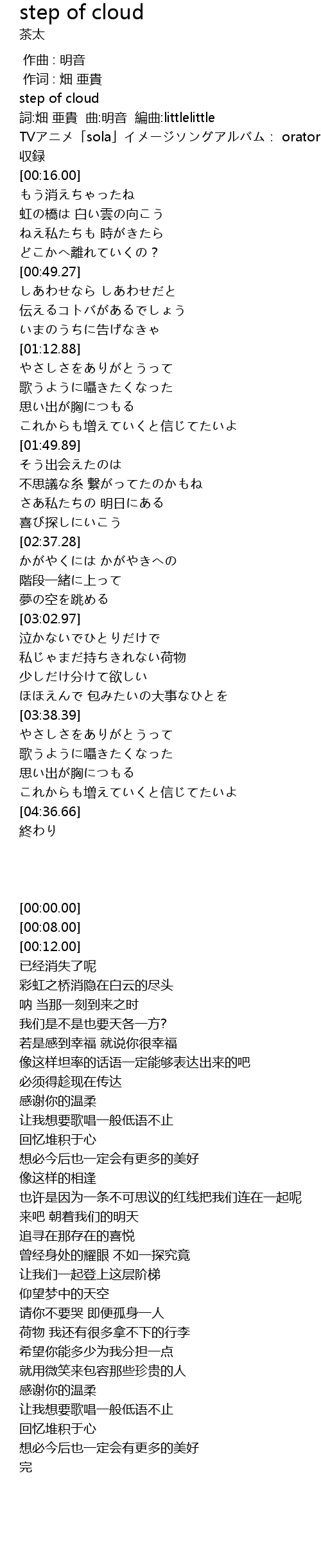 | [00:12.00] | TVアニメ「sola」イメージソングアルバム: oratorio 収録 |