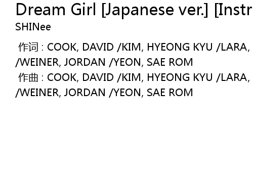 | [00:00.000] | 作曲 : COOK, DAVID /KIM, HYEONG KYU /LARA, EDWARD ROSS /SHIN, KYUK /WEINER, JORDAN /YEON, SAE ROM |