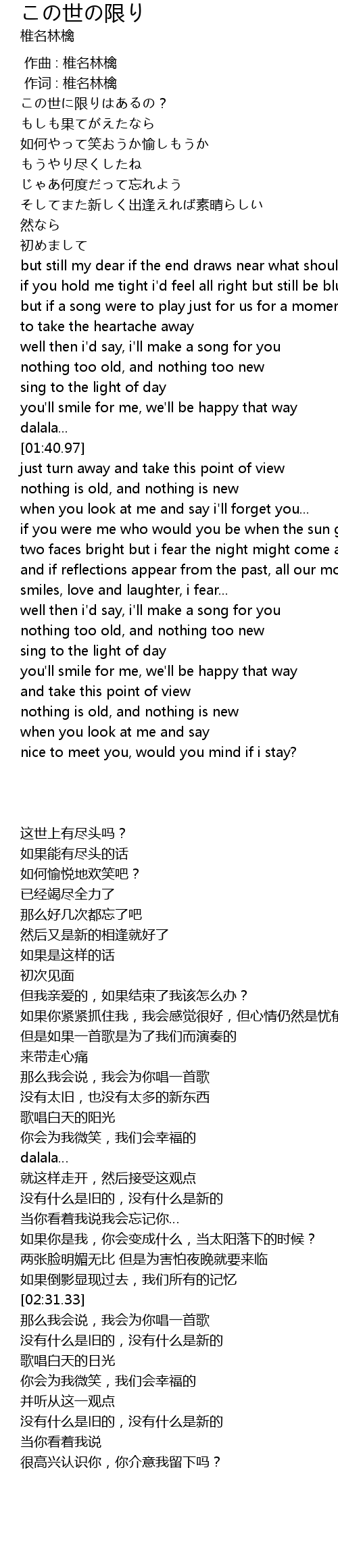 | [03:03.54] | nice to meet you, would you mind if i stay? |