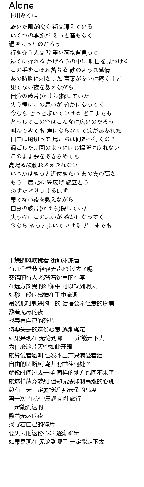 | [00:33.190] | いくつの季節が そっと音もなく 過ぎ去ったのだろう |